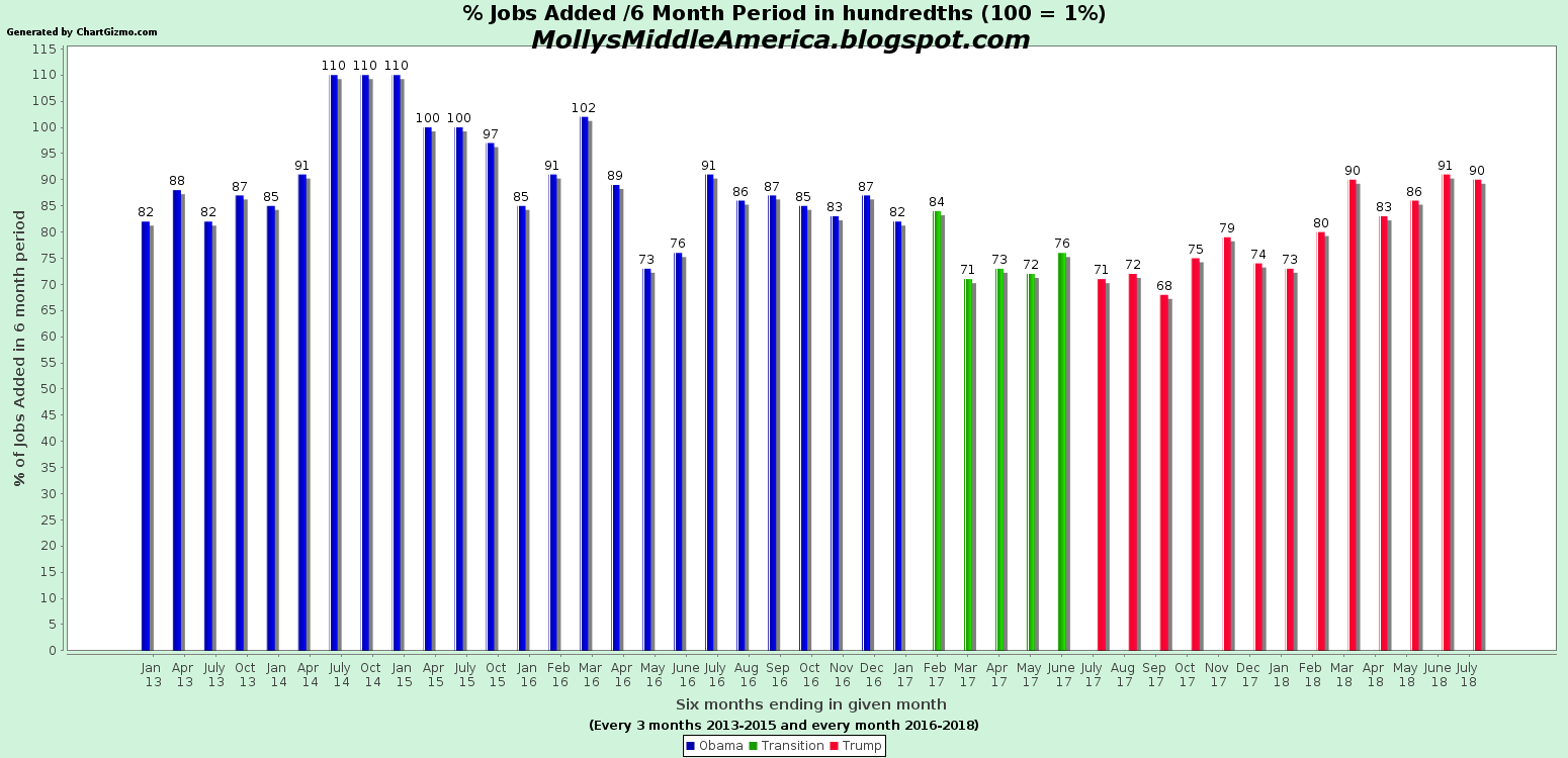 On the following chart each bar represents the % increase in jobs over a 6 month period ending in the designated month. Blue bars represent six month periods during the Obama Presidency; green bars represent six month periods overlapping Obama and Trump Presidencies; red bars represent six month periods during the Trump Presidency.