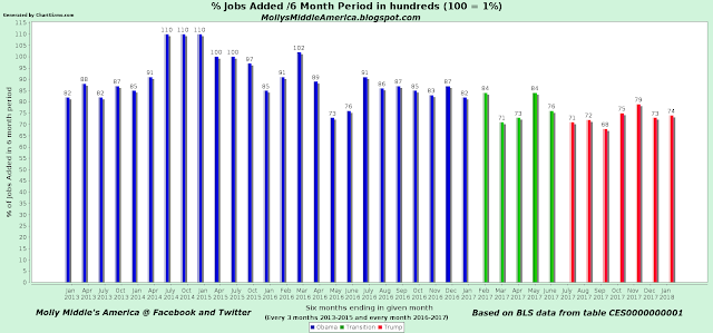 On the following chart, each bar represents the % increase in jobs over a 6 month period ending in the designated month. Blue bars represent six month periods during the Obama Presidency; green bars represent six month periods overlapping Obama and Trump Presidencies; red bars represent six month periods during the Trump Presidency.